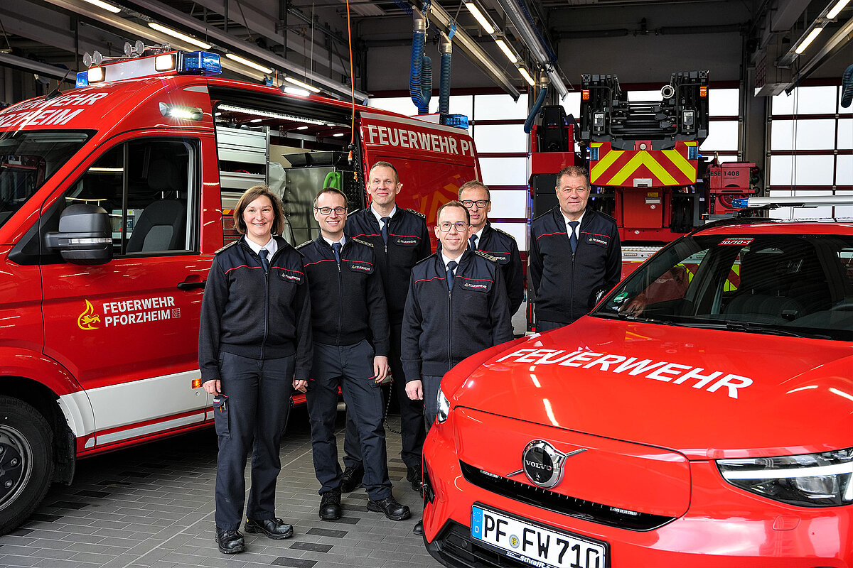 (von links): Sonja Störzbach, Lukas Hahnakam, Sven Gebhardt, Kommandant Sebastian Fischer, Guido Lobermann und Armin Reisert. Bild: ©Stadt Pforzheim; Emma Teuscher