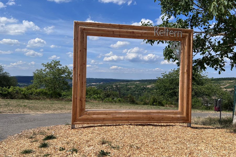 „Naturkino“ nennt die Gemeinde Keltern den riesigen hölzernen Bilderrahmen, der den Blick in die Landschaft lenkt, und trifft damit den Nagel auf den Kopf. Das Schauen ist anders – konzentrierter und zugleich entspannt; insbesondere, wenn man in der gemütlichen Weinfass-Sitzgruppe Platz nimmt, die vor dem Rahmen steht.