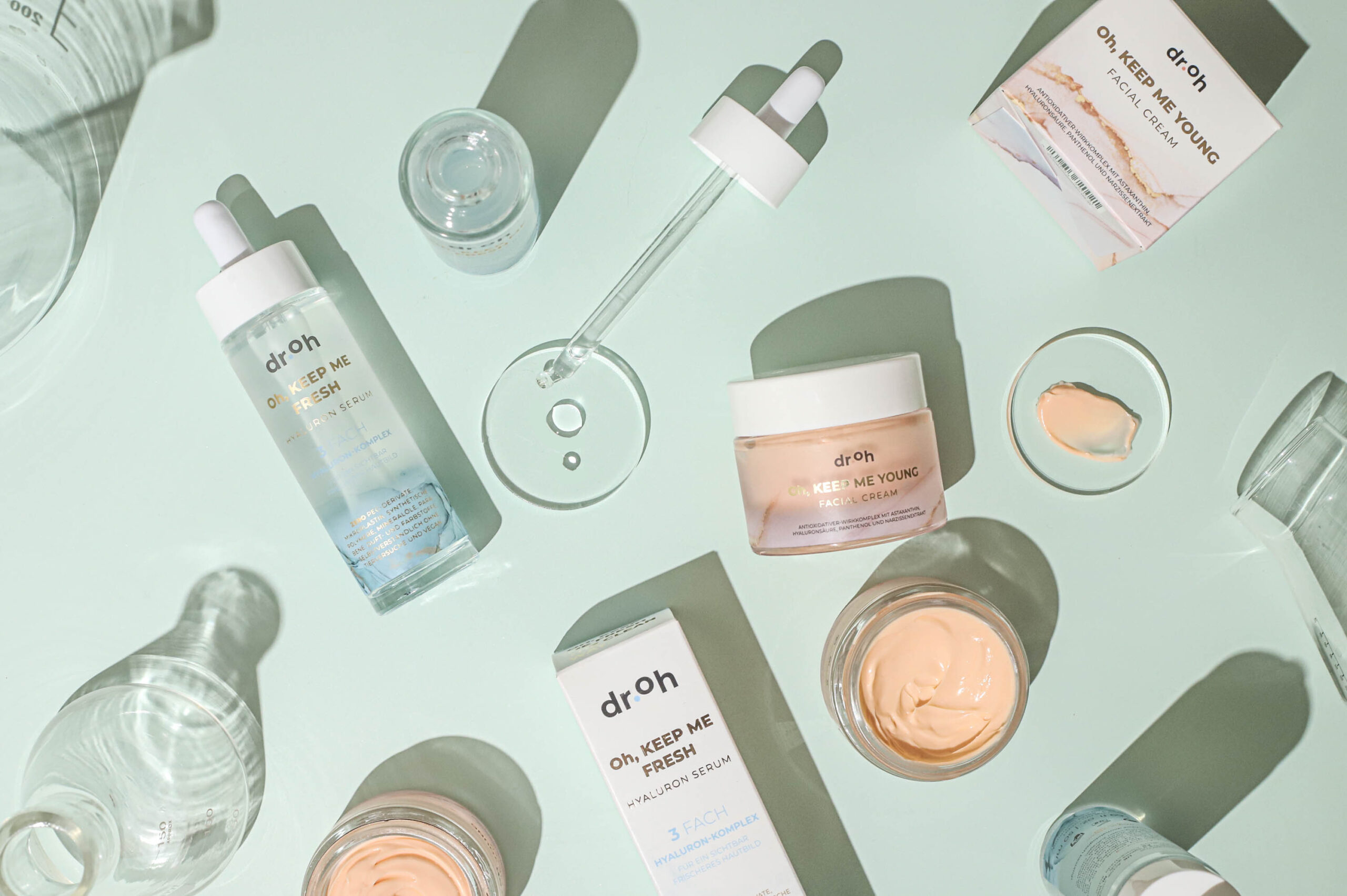 Entdecken Sie die dr.oh® Oh, KEEP ME FRESH HYALURON SERUM und die dr.oh® Oh, KEEP ME YOUNG FACIAL CREAM. Beide Produkte sind vollständig vegan und basieren auf Clean Beauty-Prinzipien, um eine ausgeglichene Rohstoffauswahl und Dosierung zu gewährleisten.