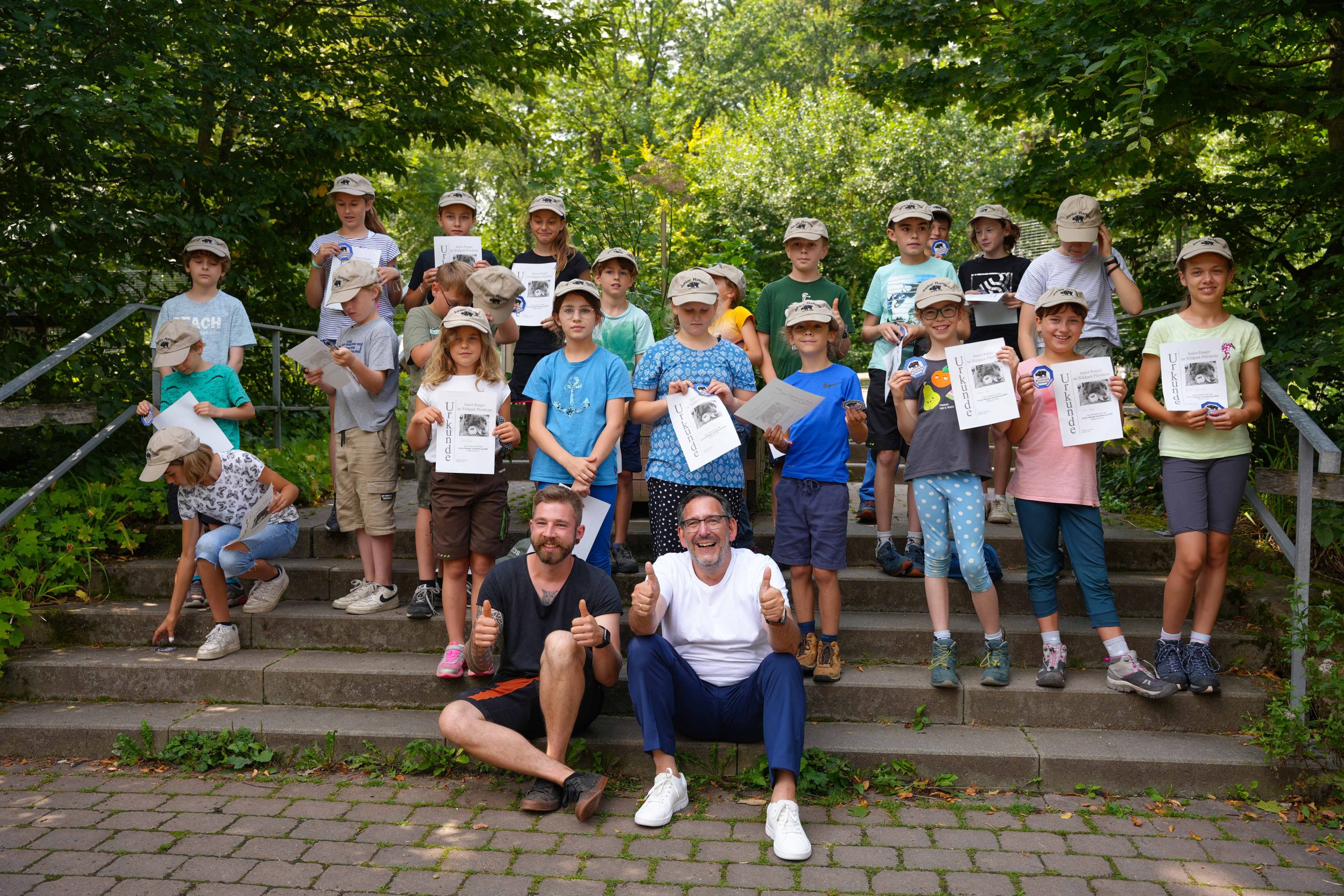 Bürgermeister Tobias Volle und Tierpfleger David Schmitt freuen sich gemeinsam mit 23 frisch gebackenen Junior-Rangerinnen und -Rangern über die bestandene Ausbildung.