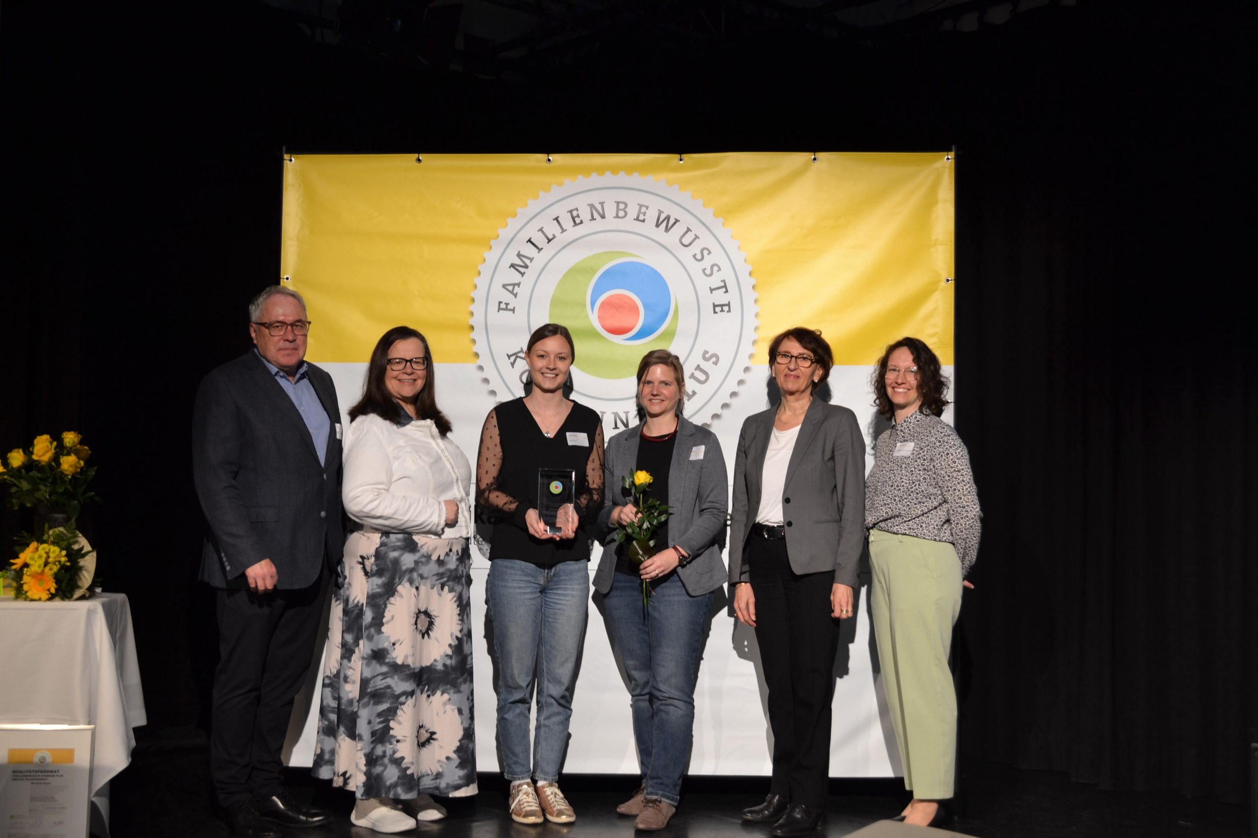 Auf dem Foto (v. l. n. r.): Patrik A. Hauns (stv. Vorsitzender der Arbeitsgemeinschaft Netzwerk Familie Baden-Württemberg e.V.), Renate Schmetz (Vorsitzende der Arbeitsgemeinschaft Netzwerk Familie Baden-Württemberg e.V.), Juliane Wagner (Koordinatorin der Familienfreundlichen Stadt – Stadt Pforzheim), Mirjam Bußmann (Sachgebietsleitung der Jugend- und Familienförderung – Stadt Pforzheim), Staatssekretärin Dr. Ute Leidig, Lara Waterstraat (Geschäftsführerin Prädikat Familienbewusste Kommune Plus UG). Bild ©Arbeitsgemeinschaft Netzwerk Familie Baden-Württemberg e.V., L. Waterstraat