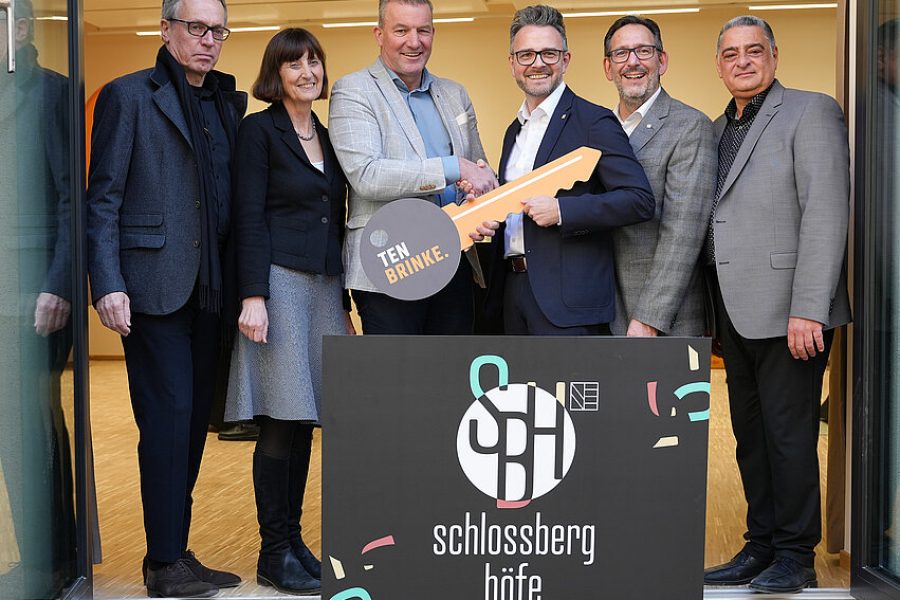 Architekt Jens Wittfoht, die städtische Projektleiterin Andrea Hermesmeier, Geschäftsführer Wim Ten Brinke, Oberbürgermeister Peter Boch, Baubürgermeister Tobias Volle und der Projektleiter Schlossberghöfe von Ten Brinke Ihab Mousa bei der offiziellen Schlüsselübergabe des ersten Gebäudes der Schlossberghöfe.