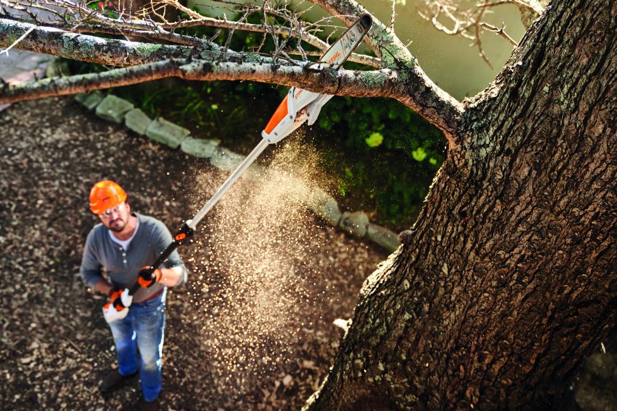 Für schnelles und sicheres Arbeiten kommt es auf die Wahl der geeigneten Werkzeuge an: Dünnere Äste lassen sich mühelos mit einer Garten- oder Astschere zurückschneiden. Für stärkeres Geäst und vor allem für Schnitte in der Baumkrone empfiehlt sich ein Hoch-Entaster. Mit sicherem Stand auf dem Boden lassen sich mit einer solchen ‚Motorsäge am Stiel‘ Äste bis zu einer Höhe von vier Metern kappen. Leise und emissionsfreie Akku-Geräte wie etwa das Stihl Modell HTA 50 schonen dabei die Nerven der Nachbarn und die Umwelt gleichermaßen.