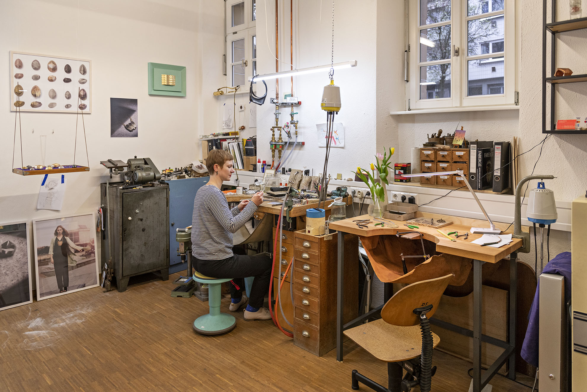 Mit dem Atelier in den Räumlichkeiten von Victor Mayer in Pforzheim hat Frieda Dörfer nach dem Ablauf ihrer Mietdauer im EMMA einen Ort gefunden, an dem sie ihr Handwerk weiterführen kann: „In Pforz-heim gibt es nach wie vor eine einzigartige Schmuckinfrastruktur und ein großes Netzwerk an Schmuck-schaffenden – insbesondere den Austausch mit den alten Meistern der manufakturellen Schmuckher-stellung schätze ich sehr.