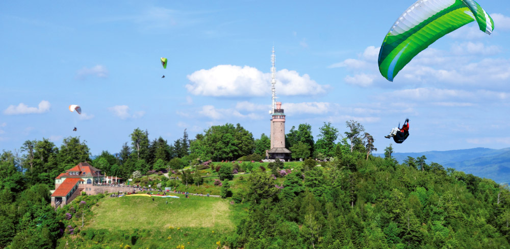 Blick auf den Gipfel mit Bergstation, Restaurant, Startplatz der Gleitschirmflieger und Turm.