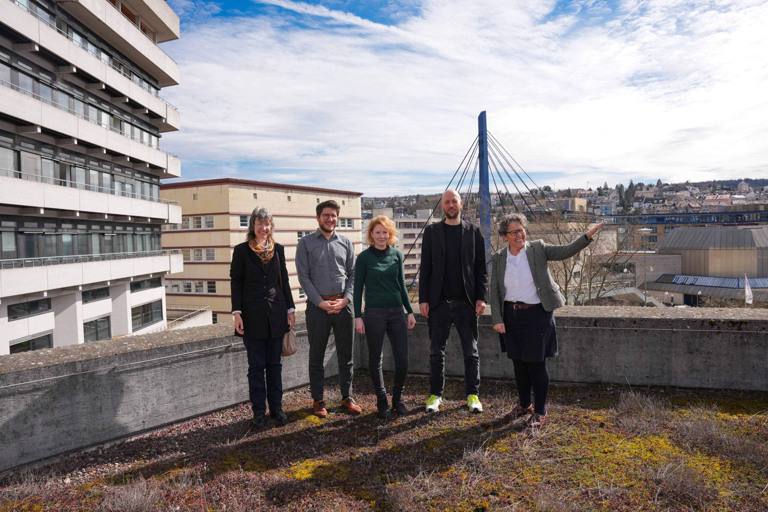 (v.l.): Sylvia Lorenz (Klimafolgenanpassungsmanagerin), Elias Weigel (Leiter Abteilung Klimaschutz), Dorothea Nultsch (Energiemanagement), Philippe Abraham (Koordinator für Klimaneutralität) vom Amt für Umweltschutz, stellen gemeinsam mit Umweltdezernentin Sibylle Schüssler die Klimaprojekte 2023 vor